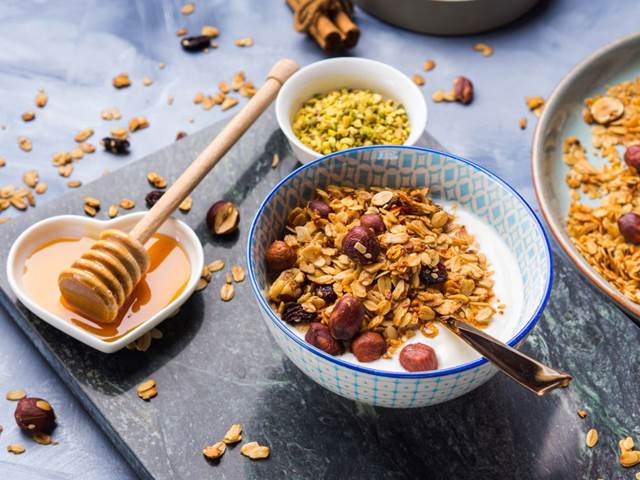 1 Smíchejte 50 g ovesných vloček, 50 g nasekaných mandlí, 1 špetku skořicového prášku, 2 lžíce medu a 1 lžičku oleje v misce a rozprostřete na plech vyložený pečícím papírem. Pečte v troubě při 175 stupních (horkovzdušná 150 stupňů) po dobu 15–20 minut až do zlatavě žluté. Občas promíchejte. Vyjměte z plechu a nechte vychladnout.