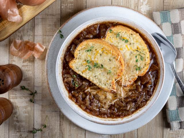 7. Hovězí à la francouzská cibulačku podávej s opečenými bagetkami se sýrem.