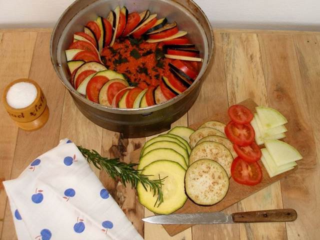 5. Zeleninový základ si vlijte do připravené remosky. Nakrájejte si cukety, lilek a rajčata na kolečka. Nakrájenou zeleninu skládejte střídavě do remosky (dle obrázku). Vše nakonec osolte, opepřete a posypte bylinkami.
