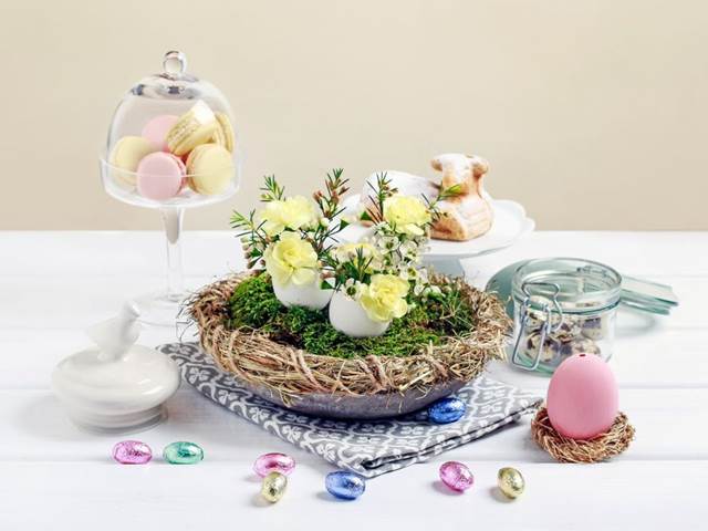 5. Vložte namočenou aranžérskou hmotu do skořápek. Skořápky můžete použít z vykouknutých vajíček, ale i z rozklepnutých, stačí je jen rozklepnout přibližně ve 2/3 a nechat si větší skořápku. Každou skořápku ozdobte oblíbenými květy, například drobnými karafiáty a opučí háčkovitou.