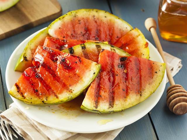 Pokud byste si přáli grilovaný meloun jako zákusek, položte kousky melounu na gril a pokapejte medem.