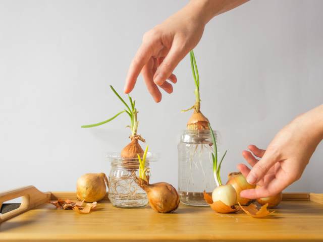 Z velké zeleninové cibule odřízněte dno jeden až dva centimetry s kořenovým zbytkem a celé vložte do hrnce se zeminou řeznou stranou nahoru. Umístěte květináč na slunné místo, pravidelně jej udržujte vlhký a brzy budete sledovat, jak vaše cibulky znovu rostou.