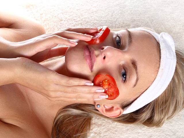 Vyřízněte si z rajčat dva širší plátky dužiny, posypte je obyčejným cukrem. Krouživými pohyby třete slupky po obličeji několik minut, poté opláchněte vodou.