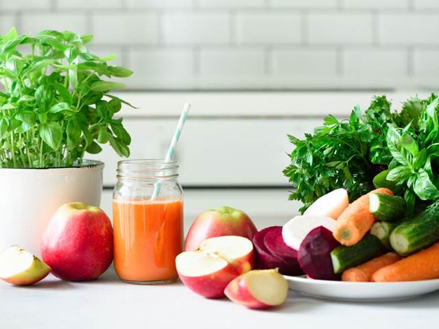 Na přípravu ozdravného džusu budete potřebovat červenou řepu, která je bohatým zdrojem vlákniny, železa, manganu, vápníku, kyseliny listové a vitaminů A a C. Mezi její schopnosti patří třeba to, že reguluje hladinu cholesterolu i vysokého tlaku. Také posiluje imunitní systém a přispívá k prevenci kardiovaskulárních chorob i rakoviny. Nachystejte si rovněž mrkev. Ta zase snižuje riziko zánětů, zachovává ostrý zrak a zlepšuje paměť. Poslední surovinou