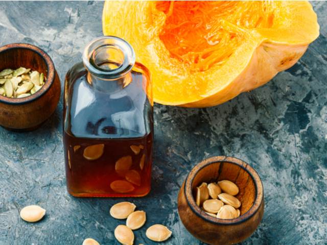 Olej z dýňových semen s jemnou oříškovou chutí a bohatým aroma ženám podává pomocnou ruku nejen v kuchyni. Výzkum (3) z roku 2022 prokázal, že jeho složení normalizuje krevní tlak a zmírňuje návaly horka i další nepříjemné menopauzální symptomy. Zčásti je to dáno tím, že zprostředkovává fytoestrogeny, které podporují stabilizaci hormonální rovnováhy.